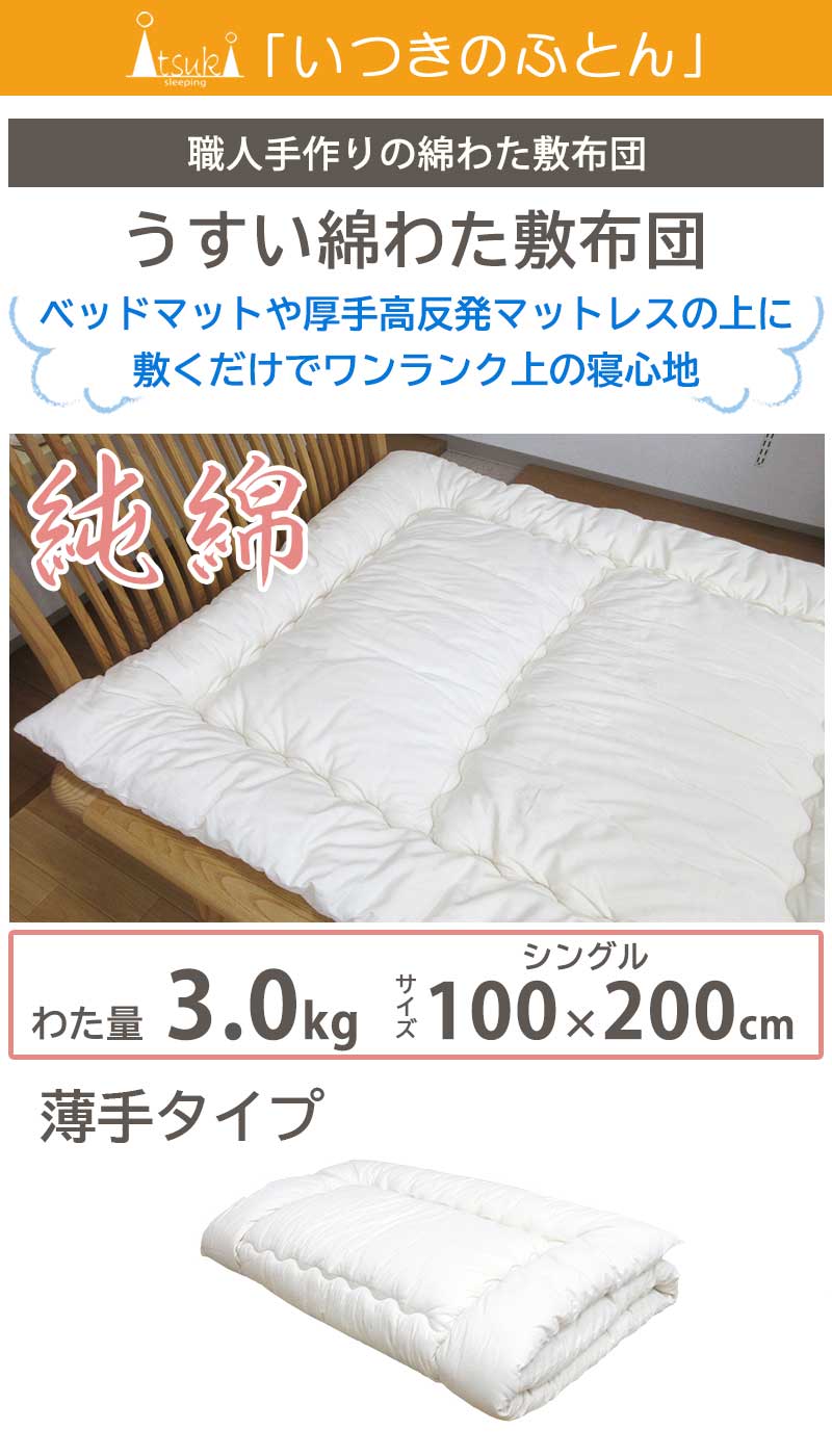 純綿 うすい敷きふとん 約100×200cm シングル ベッド用 綿わた100% 職人 手作り 日本製 和ふとん 敷き布団 和布団 丸めれる 軽量 軟敷き やわらかい 軽い