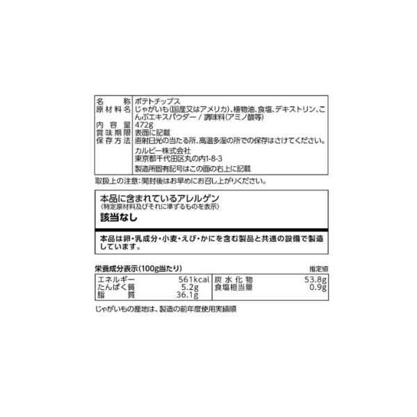 パリッと軽い食感が楽しめるベーシックポテトチップス 定番のうすしお味 472gのスーパービッグサイズ じゃがいものおいしさを生かした、カルビーならではのパリッと軽い食感と、ほどよい塩味で、どんどん食べ進むおいしさです!