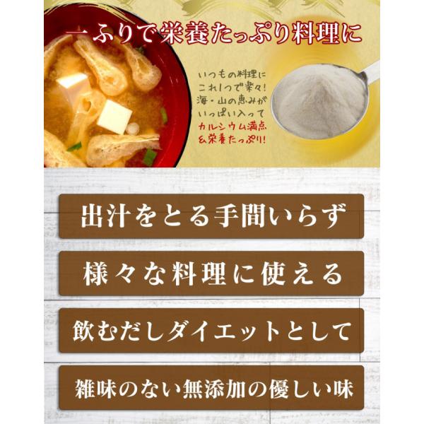 福岡、長崎県近海産のカタクチイワシ、鹿児島県近海のかつお、山口県産の無臭にんにく、北海道産昆布、大分県産原木栽培しいたけなど国産素材を贅沢に使用。