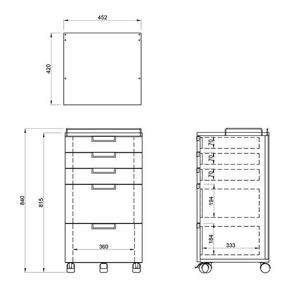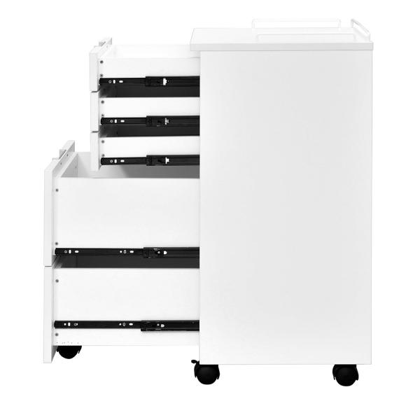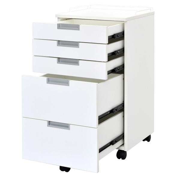 歯科医院、クリニック向けのハイタイプワゴン5段ホワイト。天板面にスチール製の落下防止バー付き。