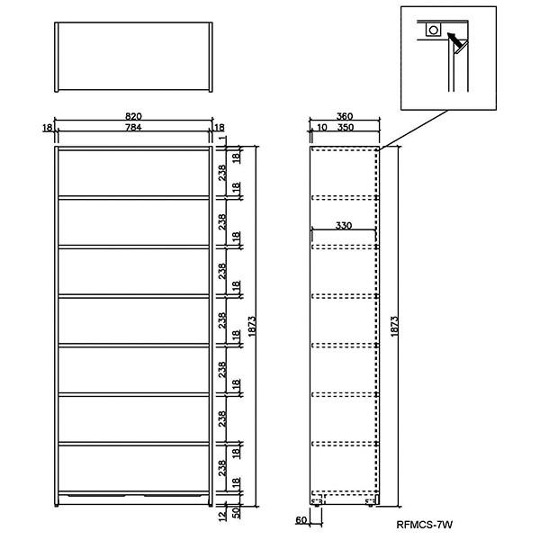 ファイルやカルテなど書類整理に便利なウッドカルテシェルフ。棚はすべて固定で取り外しできません。A4サイズを横向きに7段収納できます。表面はキズがつきにくい低圧メラミン化粧仕上げです。別売りのブックエンド(RFMCS-OPBS)を最下段にも使用いただけます。