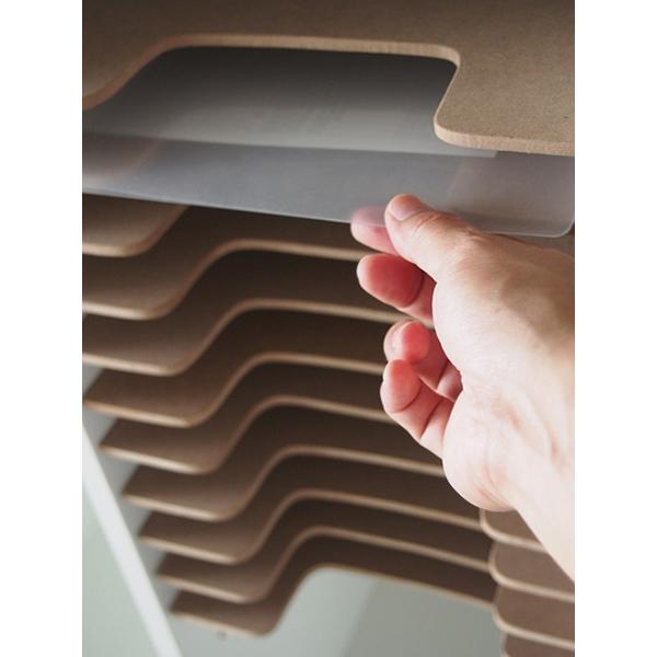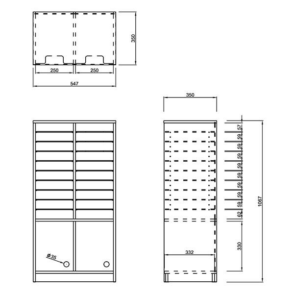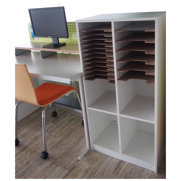 カルテやパンフレットなど書類の仕分け、整理に便利なペーパーラックロータイプダブル。MDFの可動棚板が18枚付属。下段収納部には左右それぞれに配線穴(φ35)があります。