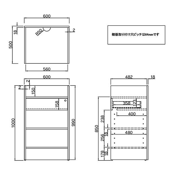 ●有効寸法/天板部:W560×D482mm、引出し:W516×D358×H123mm、棚:W560×D480mm