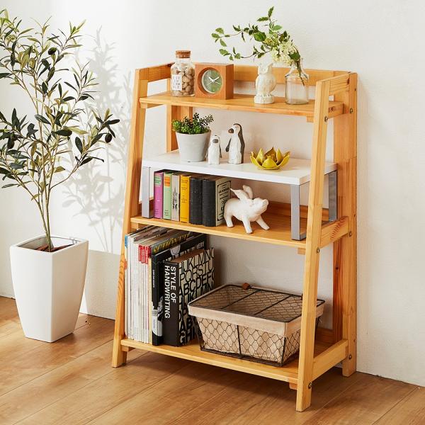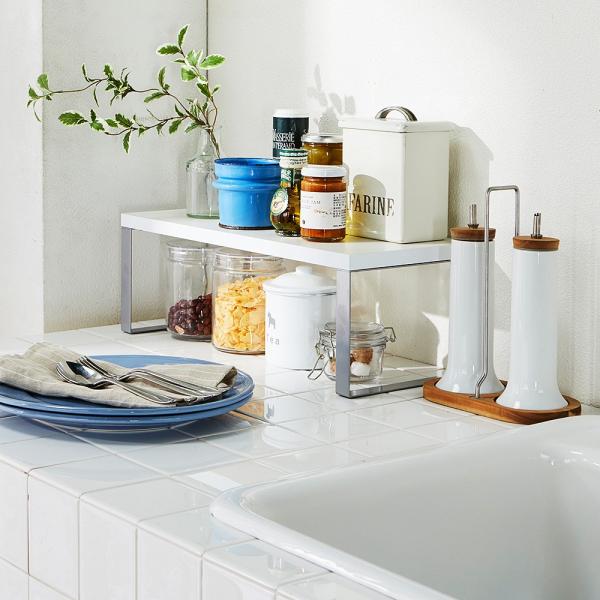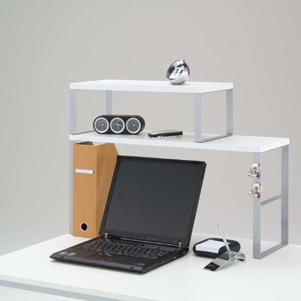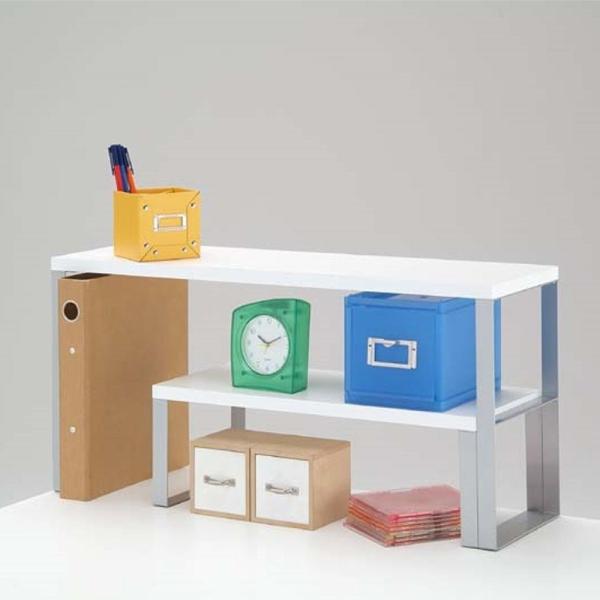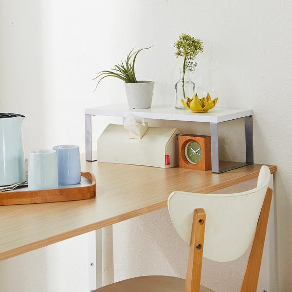 飾り棚としても使えるシンプルな小型の机上ラック。下のスペースには資料を置いたりと有効活用できます。