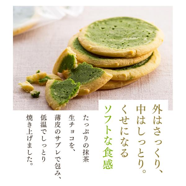 抹茶生チョコサブレはミルキーな甘さのホワイトチョコと、静岡県産一番茶の静岡抹茶を合わせ、生チョコを薄いサブレで包み込んだ半生食感の焼き菓子です。