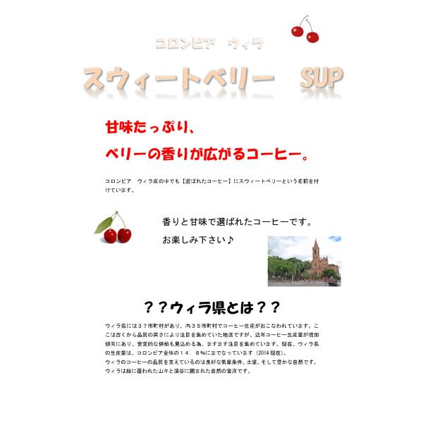 ウィラらしい華やかな香りとしっかりとした甘味。 アイスコーヒーにも最適!! <注目ポイント1> ホットでもアイスでも、 甘く、ベリー(商品名通り)を楽しめます。 コロンビア ウィラ産のSUPで 「柑橘、ベリー、グラッシー。口あたりクリーン。」という高品質商品です。 <注目ポイント2> 「コスパ高いですね」と言っていただける(はずの)商品。 <注目ポイント3> この商品は、 ウィラSUPの中でも 「柑橘、ベリー、グラッシー。」にこだわって選択したロットに命名しております。 <注目ポイント4> 美味しくないアイスコーヒーとさようならができる高品質商品。 アイスコーヒーは、 ホットコーヒーよりも贅沢に焙煎豆を使いますよね。 ※淹れ方にもよりますが。 コスト削減(経営上では必要なこと!!)のために、 珈琲豆の使用量を減らすと力が足りなくなったり・・・ 原料の品質を落とすと雑味が出たり・・・。 この商品を手に入れて、そんな悲しみとさよならしましょう〜〜♪