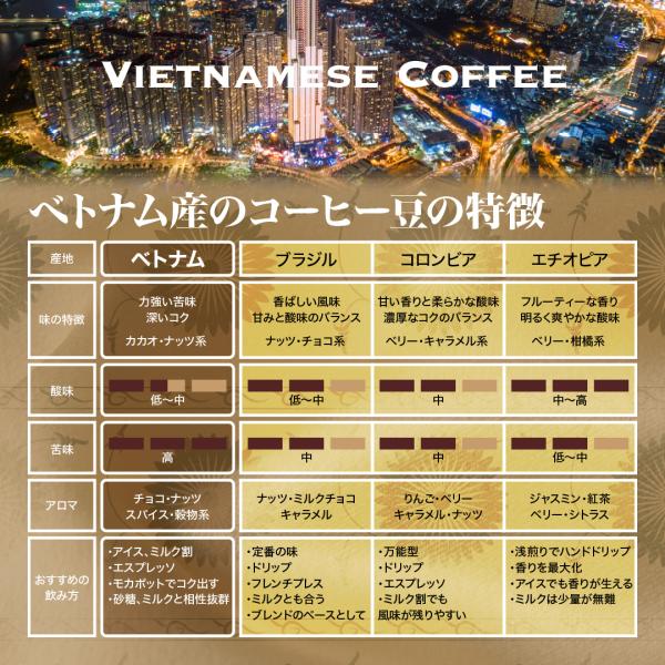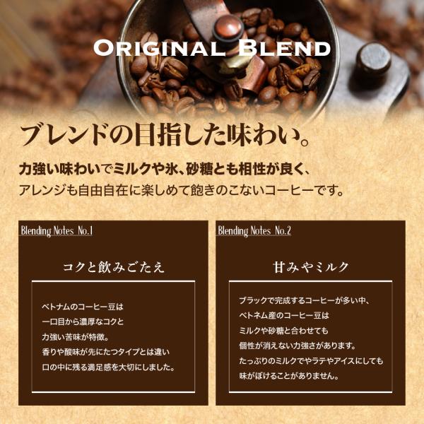 ベトナム産ロブスタの力強いコクと苦味をベースに、ブラジル サントスのナッツのような甘み、コロンビア スプレモのバランスの良い味わい、そしてモカ シダモの華やかな香りを加え、コク・甘み・香りが調和した飲みやすいブレンドに仕上げました。