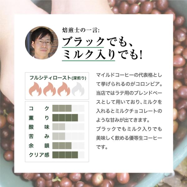 マイルドコーヒーの代表格として挙げられるのがコロンビア。当店ではラテ用のブレンドベースとして用いており、ミルクを入れるとミルクチョコレートのような甘みが出てきます。ブラックでもミルク入りでも美味しく飲める優等生コーヒーです。