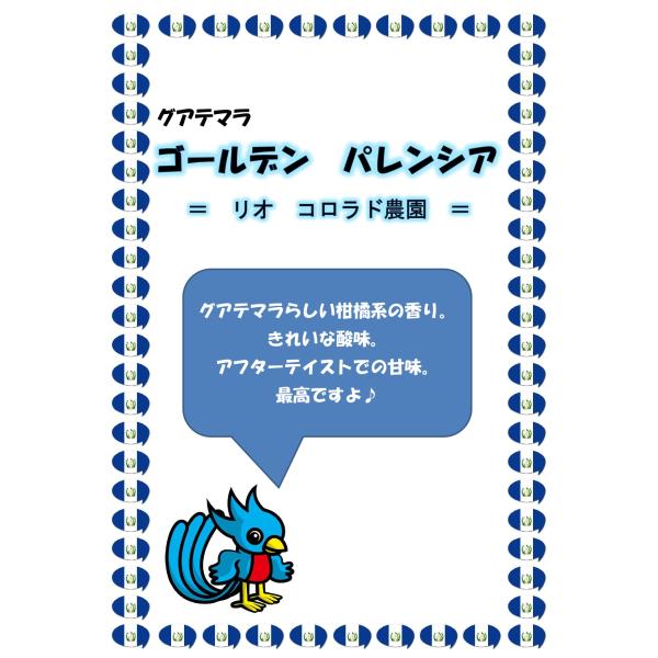 ”明るい” 柑橘系の香りがきれいに広が〜る。 コスパにも注目♪ この商品について 良質なコーヒーを産出することで世界的に高く評価されているグアテマラ産コーヒーですが、ANACAFEの指定する8つのエリア以外からも良質なコーヒーを探し求めることが可能です。 パレンシア地区もその一つで、パレンシア地区及びその周辺(マタケスクイントラ地区)で生産される良質コーヒーに「ゴールデン パレンシア」と命名しています。 その中から弊社が今年取り扱う商品は【リオ コロラド農園】のコーヒーです。 = 余談 = 芯のある、若々しいしっかりとした人。 そんなイメージを感じるコーヒー。