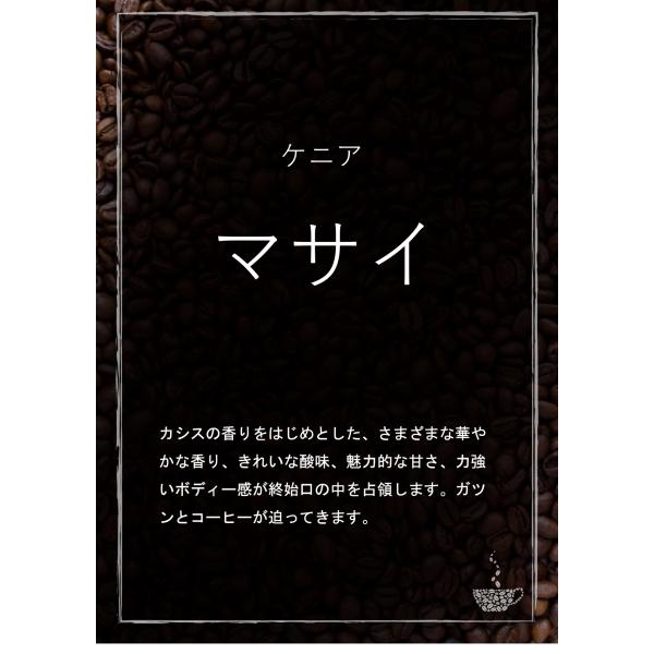 「強い」コーヒーが好きな方に!! マサイを作ってもらっている輸出業者ドーマン社が 【マサイAA】のターゲットにする風味をしっかり把握していること。 ファクトリー毎においしいのはその通りですが、 それらを組み合わせて目指す「いつものマサイ風味」に仕上げてくれています。 そこにはもちろんドーマン社との信頼関係も重要です。 美味しいのは前提として、 それを長年続けているというところに【マサイの凄み】があります。 ず〜〜っと、いつも安心して飲んでいただけます。 どんなことでも「継続」って重要ですが、難しいですよね。 ケニアコーヒーの力強さと風味を より鮮明に、クリーンに、強く感じられるコーヒーです。 カシス、柑橘などのフルーツ系の香りと、 チョコレートのような香りと甘味。 そして安定感のあるボディー。 美味しく香り、しっかり香るコーヒー。 2021/22クロップは 4つのファクトリーのブレンドです。 ファクトリーでは、完熟チェリー〜パーチメントまで仕上げてます。 ーー ニエリ 41% キリニャガ 38% ムランガ 13%: エンブ 8% ーー ※「マサイ」はドーマン社のTOPクオリティー商品のブランド名です。