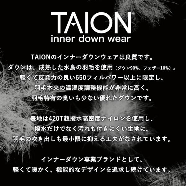 インナーダウン専門ブランド「TAION(タイオン)」より、ベストセラーアイテムの定番インナーダウンジャケットが入荷しました。軽くて反発力の良い650フィルパワー以上の超撥水加工ダウンを使用したインナーダウンジャケット。羽毛に撥水加工を施すことで速乾、保温、反発性がアップし、ダウン特有の匂いも軽減しています。表地の420T高密度ナイロン生地にも超撥水加工が施されており、撥水だけでなく汚れも付きにくい仕様に。また、ACコーティング加工を施すことで、羽毛の吹き出しを最小限に抑えています。