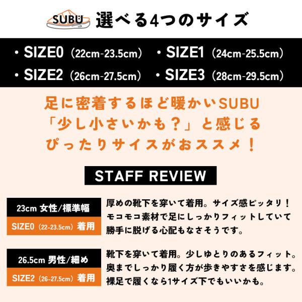 「誰も知らない冬のサンダル」をコンセプトに発売されたSUBU。サンダルのイメージを変える、秋冬用の暖かいサンダルです。コンビニなどのちょっとした外出や散歩はもちろん、秋冬のバーベキューやキャンプ、職場のルームシューズなどにも使える万能アイテムです。サンダルでは寒さを感じる季節も、内側の起毛が優しく素足を包み込んでくれます。ダウンのような暖かさと、起毛加工の内側の生地は冷え性の方にも喜ばれます。4層構造のインソールが足全体にフィットし、独自の履き心地を創り出します。