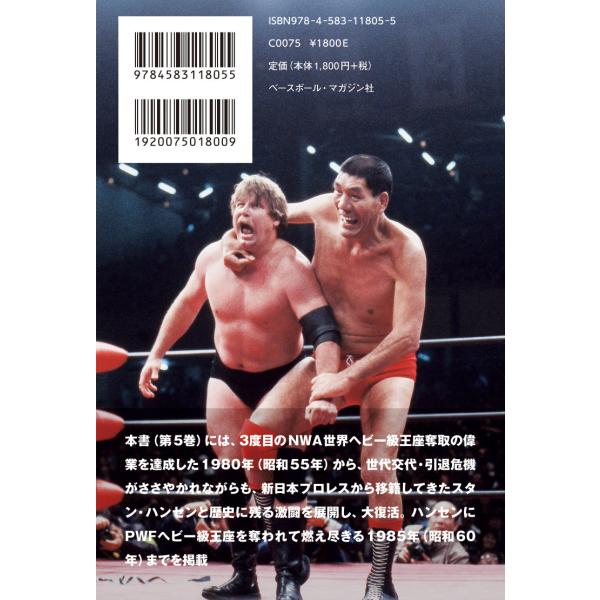 5巻には、3度目のNWA世界ヘビー級王座の1980年から、世代交代・引退危機がささやかれながらも、スタン・ハンセンと歴史に残る激闘を展開し、大復活。PWFヘビー級王座を奪われた1985年までを掲載。