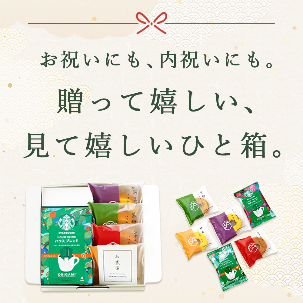 ・スターバックスオリガミパーソナルドリップコーヒー(ハウスブレンド または カフェベロナ)×1箱(各9g×4袋)、極バームクーヘン 黒糖バーム×1個、シナモンバーム×1個、さつま芋バーム×1個、和栗バーム×1個、黒蜜×1個