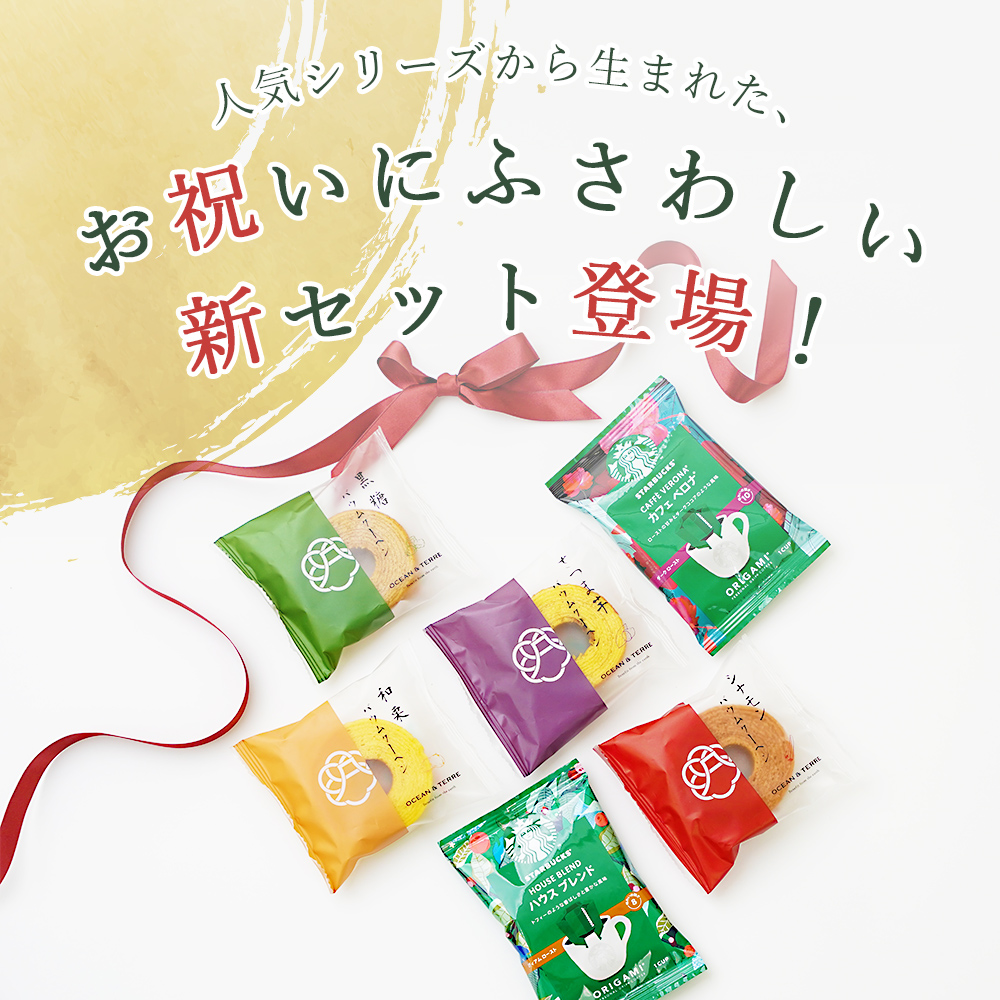 スターバックスのドリップコーヒーと、極バームクーヘン 黒糖バーム、シナモンバーム、さつま芋バーム、和栗バームの4種を常温保存で安心して贈れます。
