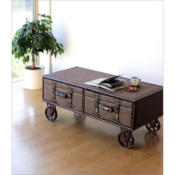 センターテーブル アンティーク アイアン おしゃれ 収納 引き出し ベッド ソファ レトロ トランク風 車輪付きドロアーテーブル