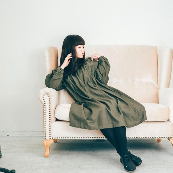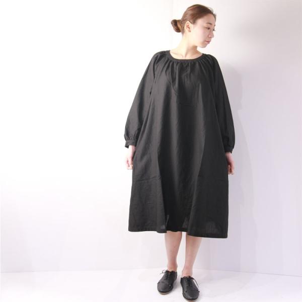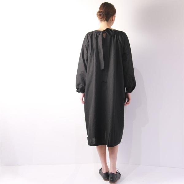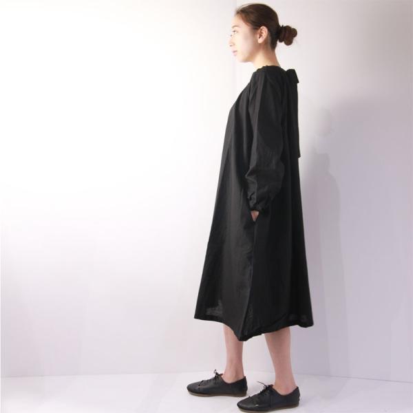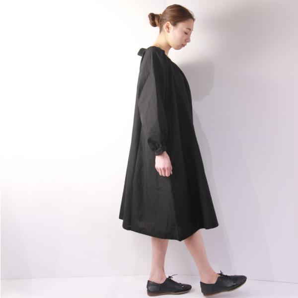 Carhaix キャレ コットンリネン ギャザー リボン 長袖 ワンピース 春 黒