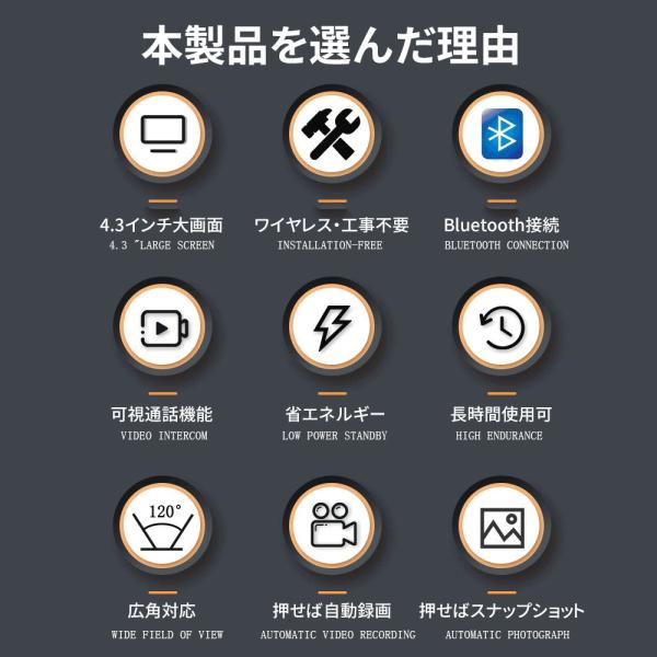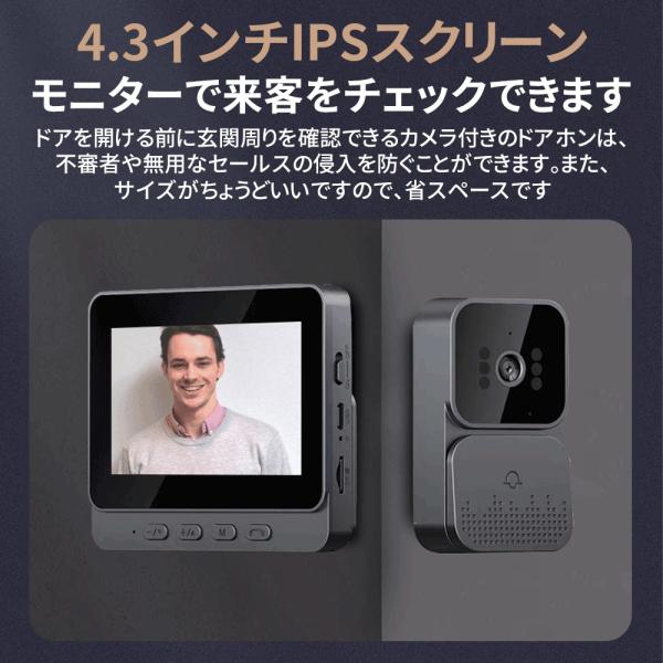 インターホン 無線 ワイヤレス ドアホン 120°広角 自動録画 カメラ付き 工事不要 双方向通話 大画面 呼び鈴 暗視 USB充電 省エネ 家 玄関防犯対策