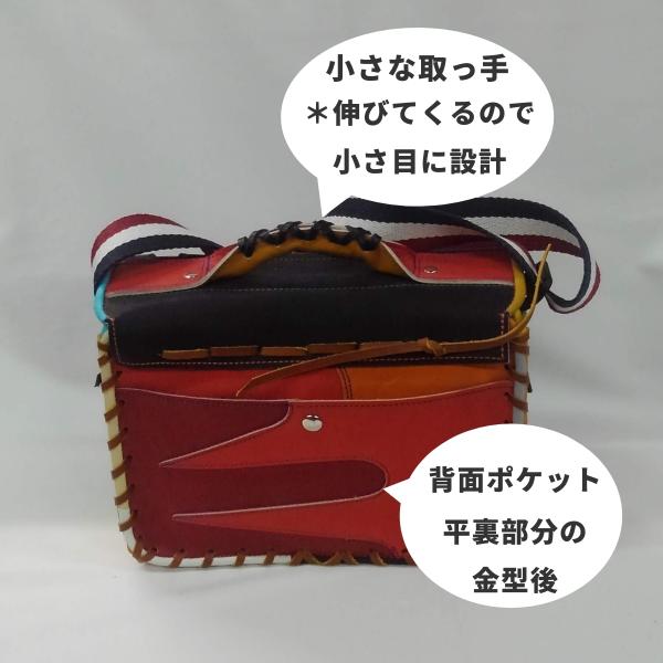 ★本体カラー:上蓋(ブラックXレッド) 正面(オレンジXライトブラウンXイエロー) 背面(オレンジXレッドXワイン) 革紐部:タン(ライトブラウン)