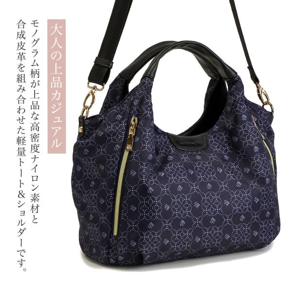 合皮とモノグラム柄ナイロンのコンビデザインがオシャレな、上品トートバッグ。