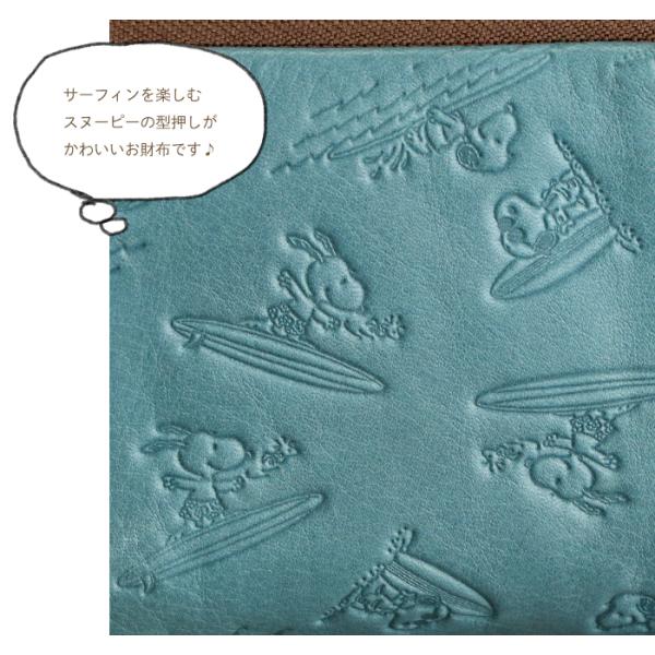 サーフィンを楽しむスヌーピーが型押しされた本革を使用し、