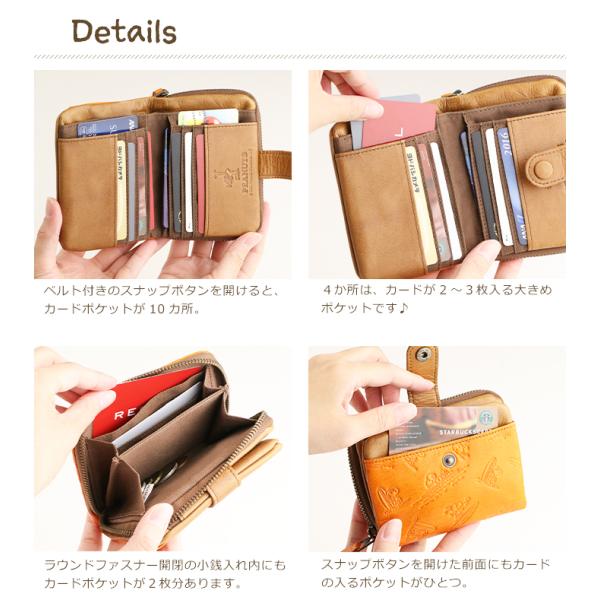 ラウンドファスナータイプ小銭入れの二つ折り財布で、全部で14枚分のカードポケット付き。