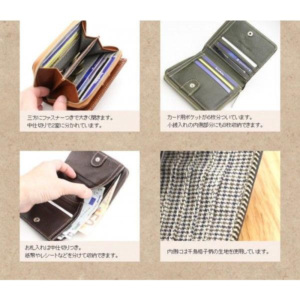 三方にファスナーがついて大きく開くラウンドファスナータイプの小銭入れつきの二つ折り財布で、カード入れは6枚分つき。