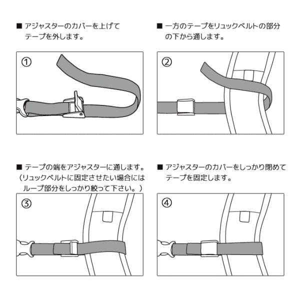 リュックベルトに通す部分をアジャスターで調節できるため、手持ちのどんなリュックにも対応可能です。
