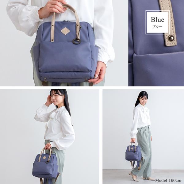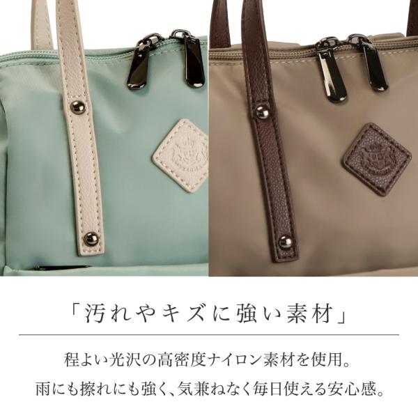 程よい光沢感のある高密度ナイロンに、シュリンク調のフェイクレザーを組み合わせた異素材コンビ、カジュアルすぎない上品な雰囲気に仕上げました。