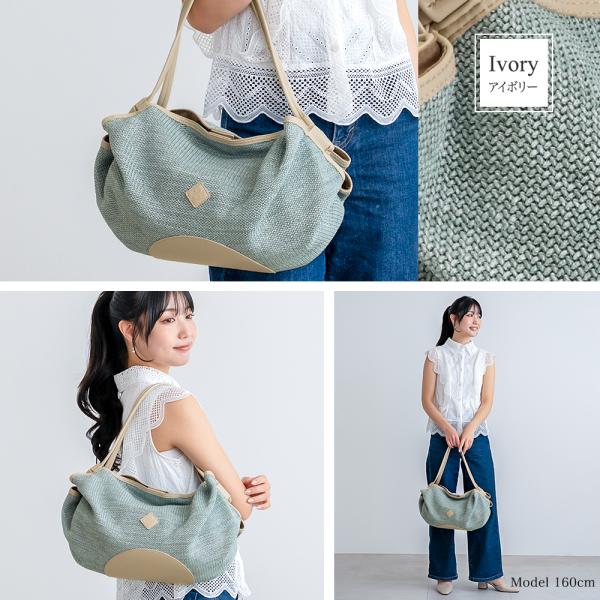 底面やハンドルにはフェイクレザーを使用、ポンポンと荷物を入れられる、ざっくりとした使い心地が魅力。