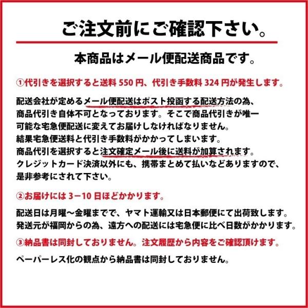 支払方法を商品代引に選択するとメール便から宅急便に変更して出荷となります。よって送料が別途700円かかります。ヤフーショッピングのシステムの問題で送料無料のまま決済完了した後に、当店が後から送料を手動加算します。予めご了承下さい。