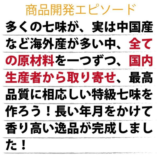 全ての原材料を国内の生産者達で作り上げた最高品質、特級七味唐辛子です。