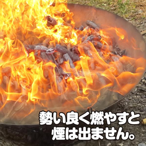 無煙炭化器は底がないボウル状のステンレスで、土の上などに置いて使います。焚付けは枯枝・段ボール等で火種を作り、気化した木質ガスが空中で燃焼し、酸欠状態の炭化器内部に熱が伝わるため、木が灰にならず炭化される仕組み。効果的な空気の対流を促す構造で、煙が出にくく内部の温度は約900度ほどに上がります。横風に強く、燃料炭や竹炭、土壌改良にも活用できます。