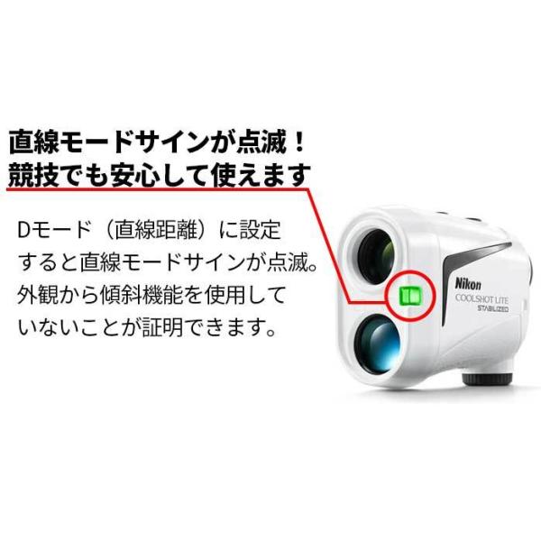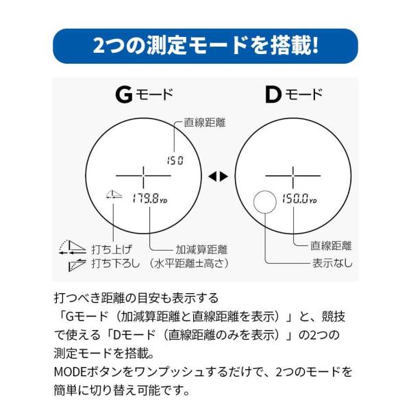 手ブレによるファインダー内の視界の揺れを低減し、照射するレーザー光のブレも同時に補正。ピンフラッグなどの小さなターゲットも素早く捉えてレーザー光を狙ったポイントに当てられる。手ブレ補正技術と測距技術を融合したニコン独自の技術。「Gモード(加減算距離と直線距離を表示)」と、競技で使える「Dモード(直線距離のみを表示)」の2つの測定モードを搭載。ワンプッシュで2つのモードを簡単に切り替え可能。Dモード(直線距離)に設定すると直線モードサインが点滅。