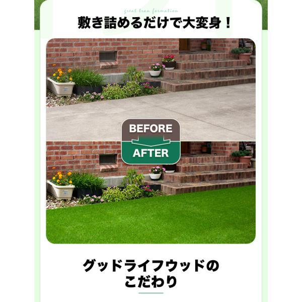 ウッドパネルやウッドデッキ、ガーデンファニチャーや花壇と相性が良く、ガーデニングとして家のリフォームやリノベーション用としてもオススメ。人工芝生は腐らず長持ちの為、DIY初心者の方から施工業者様の業者用としてまで幅広くご使用いただいています。