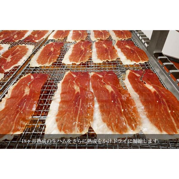 上質な生ハム産地のフビレス村産ハモンセラーノを日本入荷後、さらにじっくりと追加熟成して旨みたっぷりドライに仕上げたジャーキーのような歯ごたえの生ハムです。