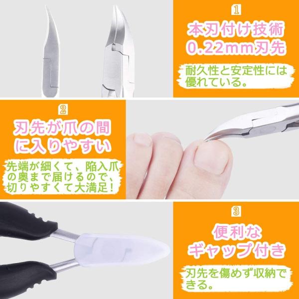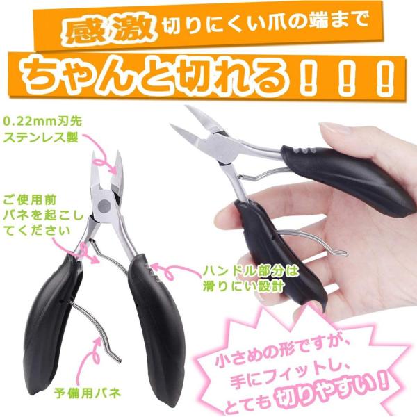 鋭角(<25°)の刃先が細くて、巻き爪や陥入爪の奥まで刃が届きます。切れ味がよく切断面もきれいです。持ち手の部分には滑りにくいデザインで握りが手にフィットして使いやさUP!