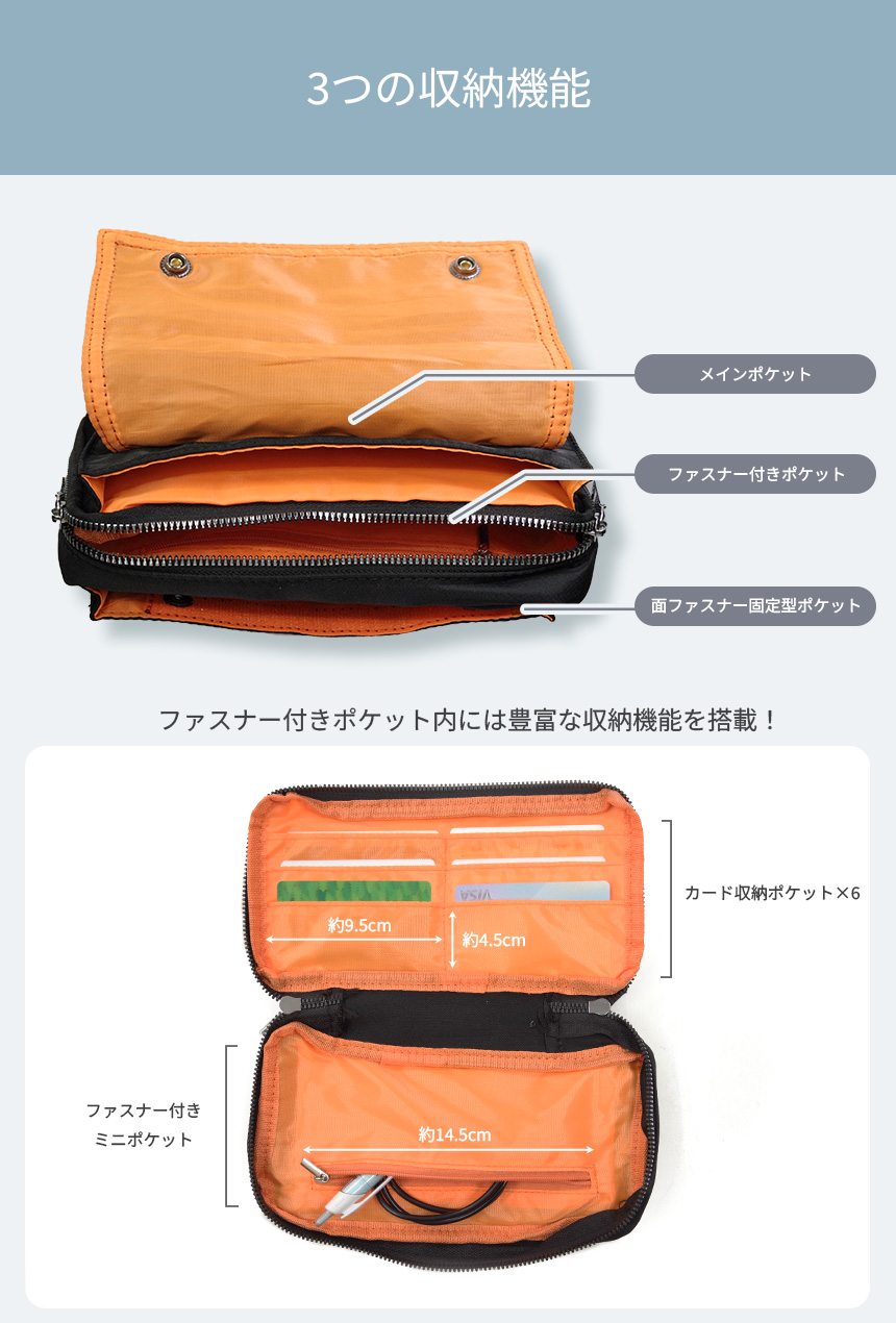 必要最低限の物を収納し持ち運びができるサコッシュです。