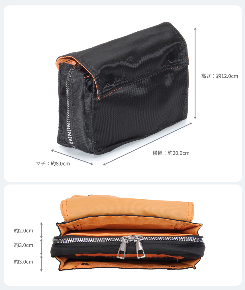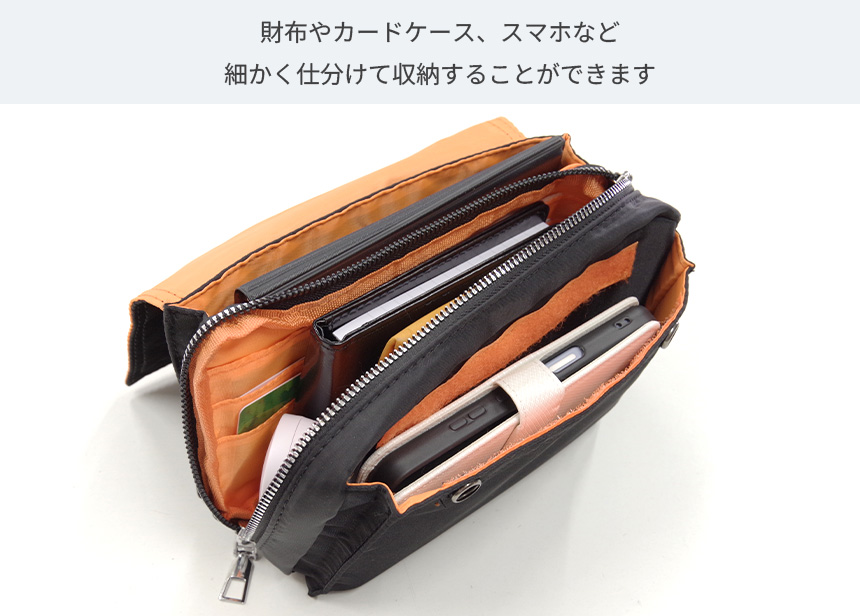 面ファスナー固定ポケットを採用し小物類の仕分けに便利です。