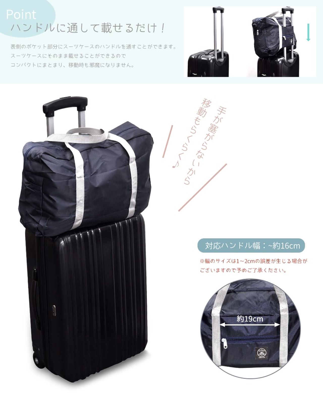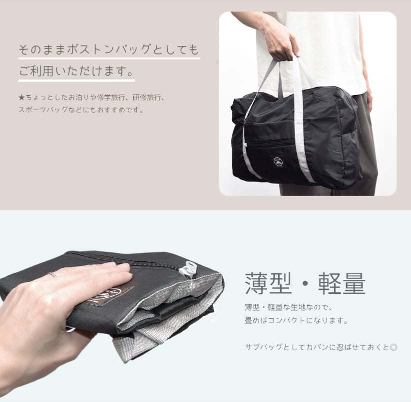 移動時はキャリーバッグの上に載せて、できるだけ手持ちせずに持ち運びできます。本体のみでボストンバッグとしても使用可能。