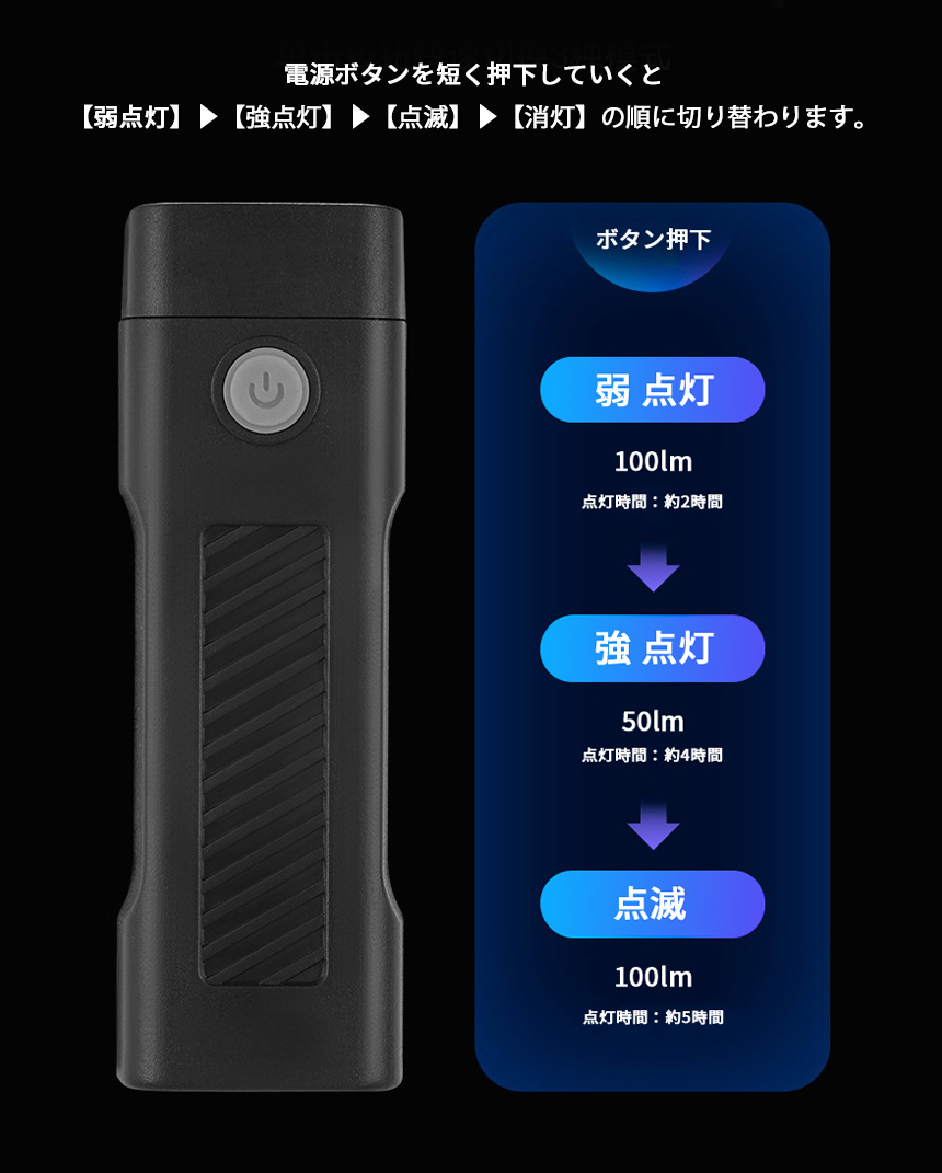 ボタン押下で強点灯→弱点灯→点滅→消灯の順に切り替わります。
