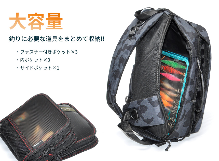 前後2気室+フロントポケット仕様でルアーや小物類などを整理ながら収納でき、