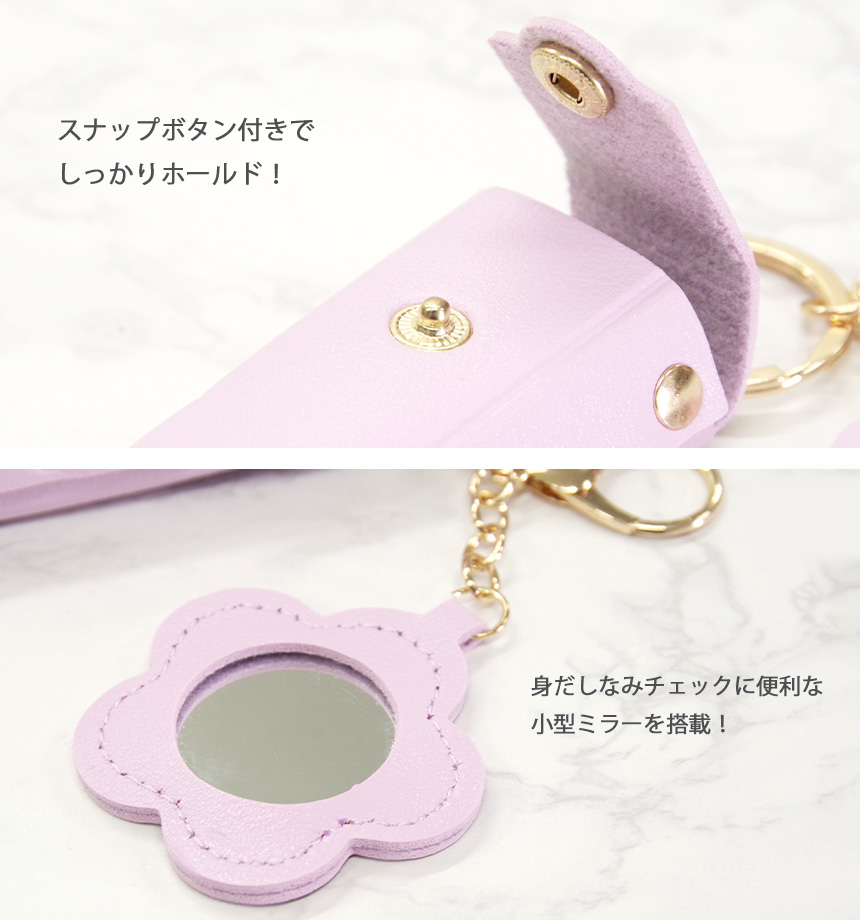 リップクリーム ケース おしゃれ かわいい リップ ホルダー 収納 花 ミラー 付き 鏡 キーホルダー キーリング 携帯 PU レザー 口紅