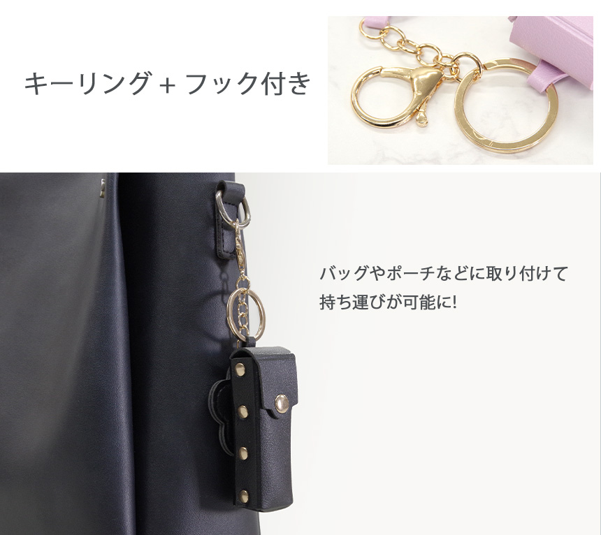 キーリング+フック付きでバッグやポーチに接続が可能!