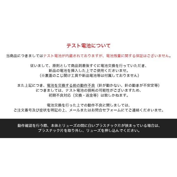 ※テスト電池に関する保証はございませんので、原則として商品到着後すぐに電池交換を行ってご使用ください