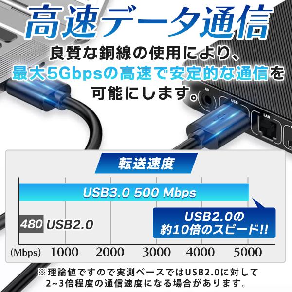 規格上、前世代のUSB2.0のデータ転送速度480Mbpsの10倍の5.0Gbpsもの速度でデータが転送できるUSB3.0に対応したケーブルです。(注:実測上速度は2〜3倍になることが多いようです。)