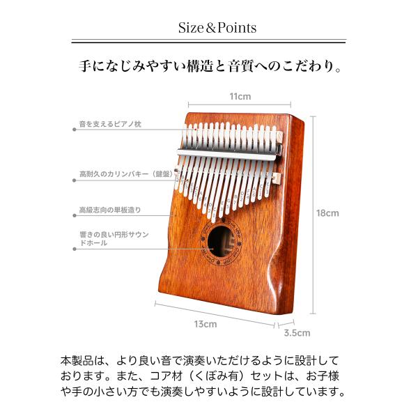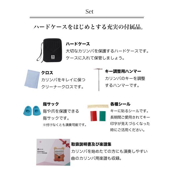 ・本商品はスターターセットとなっていて、このセットがあればすぐにでもカリンバを始められます。 セット内容:1.カリンバ本体、2.カリンバケース、3.取扱説明書及び弾き方ガイド、4.キー調整用ハンマー、5.指サック、6.クロス