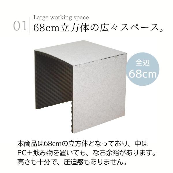 ・フェルトボードに吸音材を貼り付け、ブース状にした商品です。デスクの上に設置し、中にパソコンなどを置いてご使用いただけます。(コードを通す穴も空いております)縦・横・高さ各68cmの立方体状のブースとなっており、十分な広さで作業していただけます。