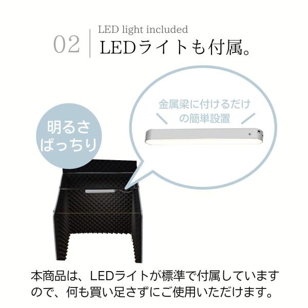 ・LEDライトが付属しており、お好みの位置に設置することができ、明るさの調節が可能となっております。
