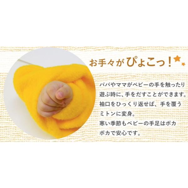 柔らかな肌触りでフードにはボンボンが付いています。ボタンや紐、マジックテープやスナップ、ファスナーなど使用していないので安心な上、脱ぎ着も楽。